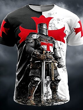 Camiseta Masculina Cruzados Cavaleiros Templários Guerreiro Medieval T-Shirt Estampa Completa Cruz Vermelha Dividida Preta Branca Gráfica Manga Curta Gola Careca Retro Superior Roupas Designer