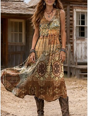 Mulheres Vestido midi Vestidos Para o Verão Vestido A Line Férias Casual Boho Feriado Normal Gráfico Geométrica Sem Manga Decote V Marron cáqui Verão Primavera
