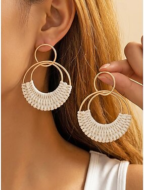 Brincos de argola trançados em estilo boêmio feminino, brincos redondos marcantes em liga metálica e rattan em várias cores, perfeitos para viagens à praia, resorts e para o dia a dia no verão.