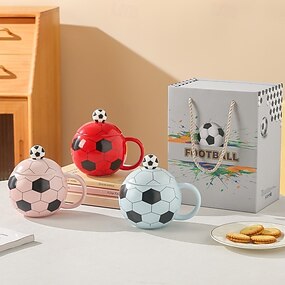 Conjunto de caneca de cerâmica em formato de bola de futebol, 350ml (12oz), com tampa e colher. Caneca de café como lembrança esportiva, em caixa de presente. Ideal para fãs de futebol.