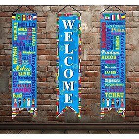 Bandeira da Copa do Mundo de Futebol de 2026, banner para torcedor, decoração de fundo para festa, banner de boas-vindas para porta, placa multilíngue de boas-vindas, bandeiras internacionais para