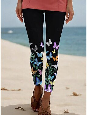 Mulheres Calças Leggings Roupa de rua Casual Comprimento total Cintura Alta Borboleta Cintura elástica Imprimir Respirabilidade Confortável Com Stretch Férias Rua Roupa Diária Preto Verão Primavera