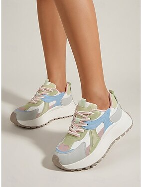 Tênis plataforma feminino robusto - tênis modernos em blocos de cores cinza, roxo e amarelo, com sola grossa, perfeitos para o dia a dia, caminhadas casuais e looks urbanos.