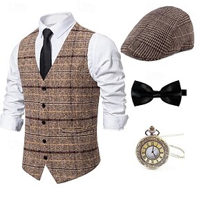 Retro Vintage Loucos anos 20 Anos 20 Roupa Colete Conjunto de acessórios Cavalheiro Mafioso Xadrez Quadriculada Fantasia Homens Fantasia de Carnaval 4 Pças. Dia Das Bruxas Carnaval Ano Novo