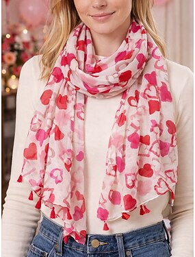 Lenço feminino leve em poliéster com estampa de corações e franjas, estilo romântico e suave, perfeito para o Dia dos Namorados, encontros românticos, uso casual no dia a dia e para sobreposições em diferentes estações.