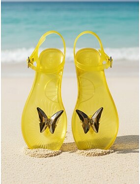 Sandálias femininas amarelas de plástico - sandálias de praia românticas e impermeáveis com decoração de rosas em 3D &Tira ajustável no tornozelo para férias de verão e escapadelas em ilhas tropicais.