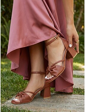 Sandálias femininas marrons com salto bloco e nó, sapatos elegantes com tira no tornozelo para convidadas de casamento em casamentos ao ar livre em jardins.