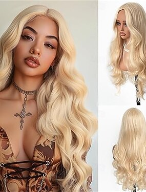 Peruca loira longa feminina de 66 cm (26 polegadas), ondulada, sintética, com ondas naturais, repartição central, resistente ao calor, aparência natural, mestiça de loiro e cacheado, ideal para uso