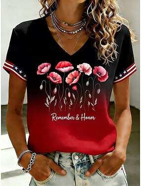 Dia da Independência Americana Mulheres Camiseta Imprimir Âmbar Floral Gráfico à moda Clássico Casual Manga Curta Decote V Tops regulares Casual Diário Preto e Vermelho Vermelho Verão Primavera