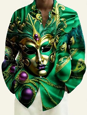 Carnaval Homens Carnaval Contas Máscara com penas Camisa Social camisa de botão Manga Longa Vintage retrô Feriado Verão Primavera Aberto para a Lateral Impressão 3D Camisa tipo linho Roxo Verde