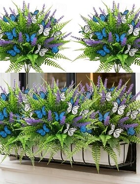 Conjunto misto de 13 peças de flores artificiais, incluindo borboletas, lavanda e samambaias - flores artificiais resistentes aos raios UV para decoração de festas, em tons vibrantes de azul e roxo