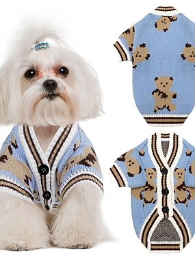 suéter fofo para cachorro macio quente outono inverno com decote em v roupas de cachorrinho de malha engraçado urso estampado suéteres cachorrinhos com mangas roupas azuis para animais de estimação