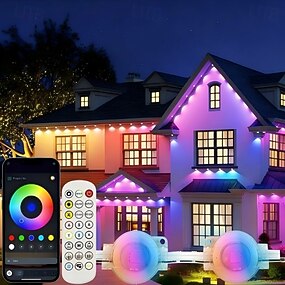 Luminárias externas permanentes, iluminação inteligente RGBIC para beirais com aplicativo e controle remoto, alcance de 30m/45m/60m, à prova d'água IP67, sincronização com música e cenas personalizadas para decoração de jardim, casa, festas e feriados.