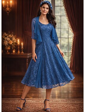 Sereia Longuette Vestido de festa Vestido Coquetel Vestido de convidada de casamento Vestido Para Mãe dos Noivos Manga 3/4 Decote Quadrado Elegante Vintage Convidado do casamento Festa de Casamento