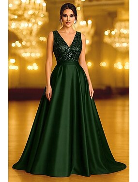 Linha A Longo Bordado com miçangas Vestido formal Vestido para a mãe da noiva Vestidos de noite Vestido de Baile Vestido formal Elegante Vintage Brilhante Sem Manga Decote V Casamento Formal Bolsos