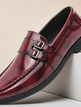 Mocassins masculinos bordô com fivela de fivela, em couro brilhante, sapatos sociais formais sem cadarço para casamentos, negócios, noivos, escritório, banquetes, festas, eventos noturnos, estilo elegante e formal.