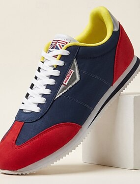 Tênis masculino retrô colorblock com cadarço, nas cores azul marinho, vermelho e amarelo. Leve e ideal para caminhadas, viagens, uso diário e estilo urbano.