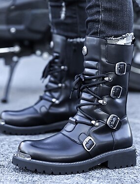 Botas de combate pretas masculinas com múltiplas fivelas – botas resistentes em couro sintético para uso casual e atividades ao ar livre.