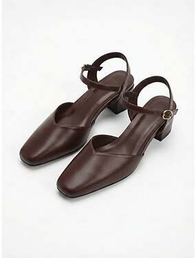 Sapato feminino marrom escuro de bico quadrado com tira no calcanhar - modelo profissional para o escritório, com salto bloco e tira ajustável no tornozelo, ideal para o dia a dia no trabalho e para