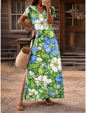 Mulheres Vestido Longo Vestido A Line Casual Praia Normal Floral Gráfico Manga Curta Decote V Azul Rosa Roxo Verde Verão Primavera