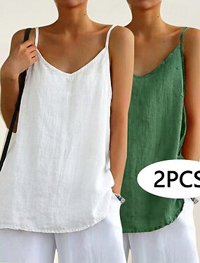 Conjuntos de Linho Falso como Algodão para Mulheres Sem Mangas Gola em V Plain Elegante Moda Streetwear Casual Para o Dia a Dia Externa Preto Verde Militar Caqui Verão Ajuste Regular