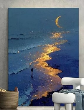 Pintura a óleo artesanal em tela, arte de parede, pintura abstrata com textura de praia dourada ao nascer da lua, decoração para sala de estar, hall de entrada, decoração para casa, pintura enrolada