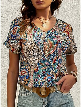 Mulheres Camiseta Imprimir Gráfico Estampado Cashemere Vintage à moda Casual Manga Curta Decote V Tops regulares Diário Final de semana Roupas de férias Azul Roxo Verão Primavera
