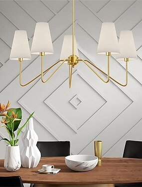 Lustre clássico de 5 braços em dourado polido com cúpulas de linho branco, luminária de teto para sala de jantar, sala de estar e hall de entrada.
