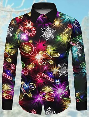 camisas masculinas de natal com estampa de luzes de natal, estampa de pão de gengibre, casual, uso diário, saída, outono&inverno turndown manga longa preto, verde exército, vermelho s, m, l