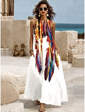 Mulheres Vestido Longo Vestidos Para o Verão Vestido A Line Vestido de verão Férias Casual Boho Diário Feriado Ajuste Largo Gráfico Tribal Pena Sem Manga Decote V Halter pescoço Azul Preto Branco Luz