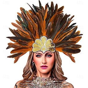 Carnaval 2026 Acessórios de Samba do Carnaval do Rio - Plumas Laranja e Marrom para Mulheres - Acessório de Fantasia de Showgirl com Lantejoulas Douradas - Fantasia de Carnaval Mardi Gras Brasil