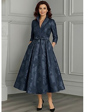 Linha A Vestidos Até o Tornozelo Longuette Vestido Coquetel Vestido Para Mãe dos Noivos Manga 3/4 Decote V Elegante Simples Casual Formal Convidado do casamento Semi formal Cetim Jacquard com Laço(s