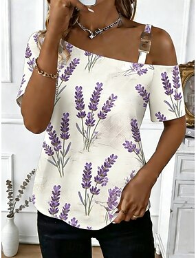 Mulheres Camiseta T-shirt Imprimir Floral Gráfico Moda à moda Clássico Manga Curta Pescoço Assimétrico Tops regulares Diário Para Noite Final de semana Branco Rosa Verde Verão Primavera