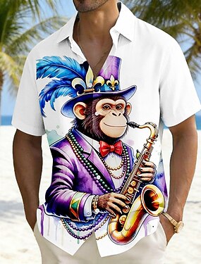 Carnaval Homens Macaco Carnaval Máscara com penas Camisa Social camisa de verão camisa de botão Manga Curta Vintage retrô Feriado Verão Aberto para a Lateral Impressão 3D Camisa tipo linho Branco 1