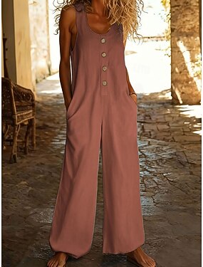 Mulheres Normal Macacão Roupa de rua Côr Sólida Sem Manga Decote U Botões Bolsos Rua Diário Normal Preto Verde Claro Rosa Verão