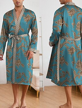 Homens Pijamas Manto de Seda Roupa de Dormir Roupão 1 PC Estampas Abstratas Moda à moda Clássico Diário Casa De Cama Poliéster Conforto Macio Decote V Manga Longa Cinto Incluso Primavera Outono Azul