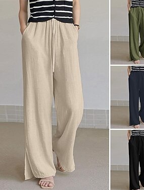 Mulheres Linho de algodão sintético chinês Calça verão Reto Férias Básico Casual Comprimento total Cintura Alta Tecido Bolsos Cintura elástica Confortável Conforto Macio Com Stretch Diário Ao ar