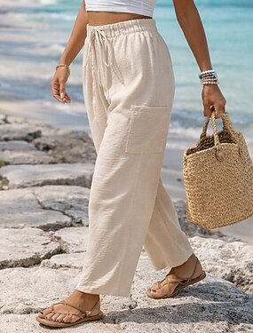 Mulheres Calças Calça casual Calça verão Calças de praia Férias Moda Casual Diário Comprimento total Cintura Alta Côr Sólida Tecido Com Cordão Bolsos Perna larga Conforto Macio Respirável Sem