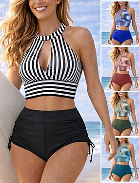 Mulheres Top de biquíni frente única Roupa de banho 2 Peças Riscas Lateral franzida Proteção UV Elástico Sem Manga Roupa de Banho roupa de banho Surfe Mergulho Natação Verão