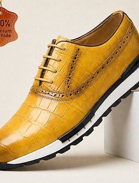 Tênis casual masculino amarelo de couro com cadarço, couro bovino macio de alta qualidade, calçado urbano estiloso para homens, ideal para uso diário e ocasiões sociais.
