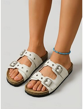 Sandálias femininas brancas de duas tiras - calçado confortável com palmilha de cortiça e fivelas ajustáveis. &Ilhós para resorts ao ar livre, férias na praia &caminhadas casuais de verão