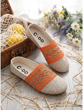 Mules femininas laranja boêmias bordadas - calçado étnico de lona de linho para piqueniques de verão e férias. &passeios na praia