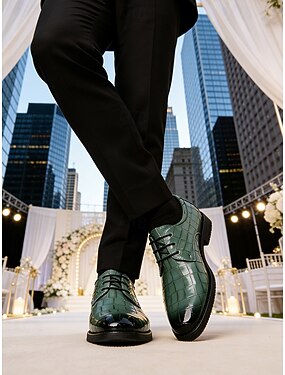 Sapatos sociais masculinos em couro verde com estampa de crocodilo, elegantes e estilosos, perfeitos para ocasiões especiais e eventos formais.