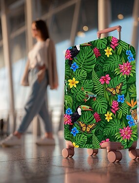 Capa protetora elástica para mala de viagem com estampa floral.