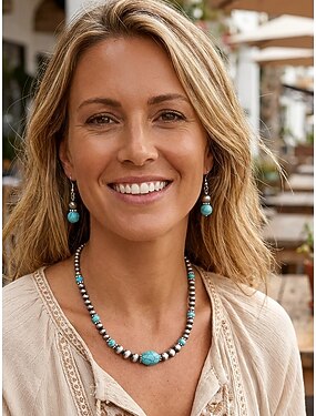 Conjunto de joias femininas boêmias em liga metálica com turquesa, composto por colar de contas e brincos pendentes, ideal para férias na praia, uso casual diário, viagens e looks de resort.
