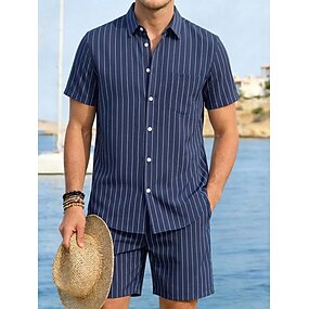 Masculino Camisa de linho 2 Peças Conjunto de camisa E Calção Shorts de linho Shorts de praia Definir Tiras verticais Casual Diário Ao ar livre Aberto para a Lateral Manga Curta Verão Moda Casual