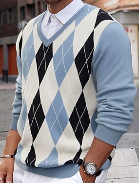 Homens Pulôver suéter Suéter de malha Estriado Tricotar Tops regulares Tricotado Xadrez Decote V Moda Básico Férias Roupa Diária Roupa Outono Inverno Azul Claro S M L