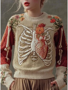 Suéter para Mulheres Estiloso Moda de Rua Casual Gráfico Esqueleto Gola Redonda Patchwork Tricotado Manga Longa Tops Regulares Tricot Rosa Outono Inverno