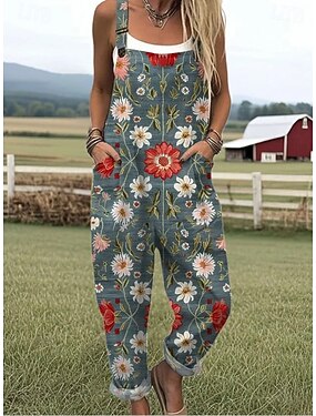Mulheres Jardineiras Ativo Floral Sem Manga Harém Com Cordão com bolso Diário Praia Ajuste Largo Azul Preto Branco Verão