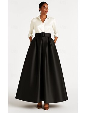 Linha A Longo Camisetão Vestido de convidada de casamento Vestido formal Vestido Para Mãe dos Noivos Manga 3/4 Colarinho de Camisa Elegante Estilo Celebridade Sedoso Festa de Jardim Casamento Formal